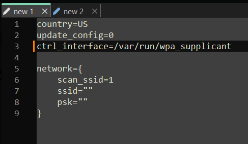 Once you’re finished flashing, open up a new text file and replicate the configuration shown in the image below. Be sure to enter the correct country code. In the field ssid=””, type your network name, and psk=””, insert your network password.
