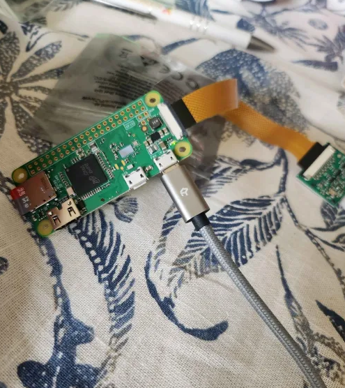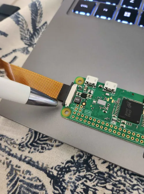 Finally, we will assemble the hardware. Begin by unfastening the black ribbon connector on the Raspberry Pi 0. To do this, gently pull the black clip away from the board. Next, insert the camera’s ribbon cable into the connector, ensuring the black side of the ribbon cable is facing upwards. Once the ribbon cable is properly aligned, push the black clip back into place to secure the connection. At this point, the ribbon cable should be securely fastened to the board and should not move.