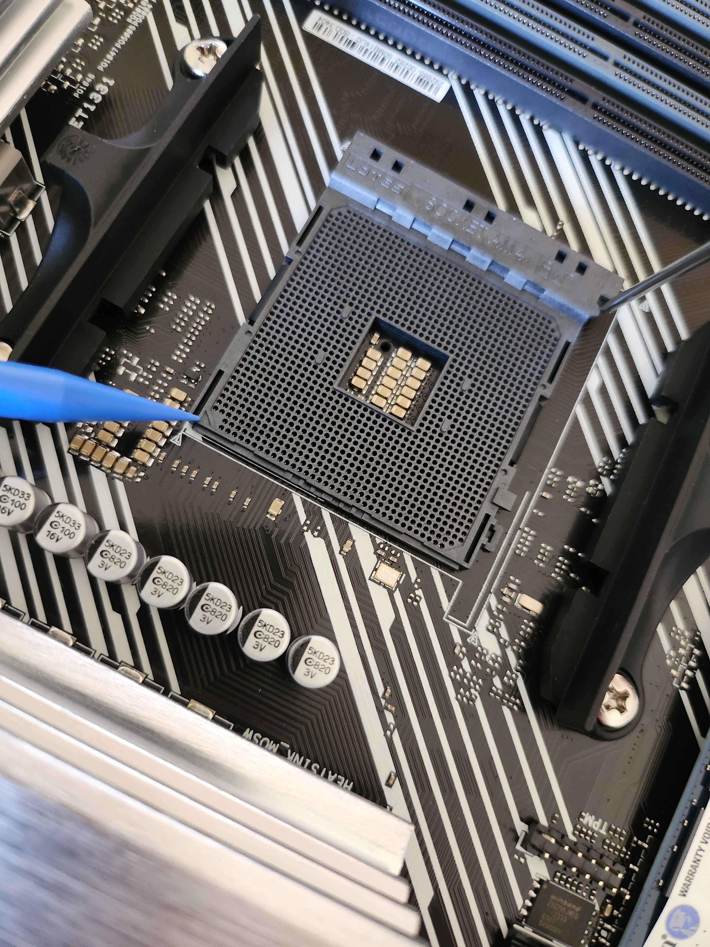 Next, I carefully installed the CPU, aligning the arrow on the CPU with the indicator on the motherboard’s CPU slot. As I locked the CPU into place, I noticed a slight gap between the CPU and the slot. For anyone who had built a computer, this situation would have been alarming. Upon closer inspection, I discovered that three pins on the CPU were slightly bent. To fix the issue, I used a magnifying glass and a plastic tool to gently straighten the pins as precisely as I could. Thankfully, after my impromptu surgery, the CPU fit flush with the slot, with no gaps. Finally, I had quickly installed the M.2 and screwed in the SSD into the board.