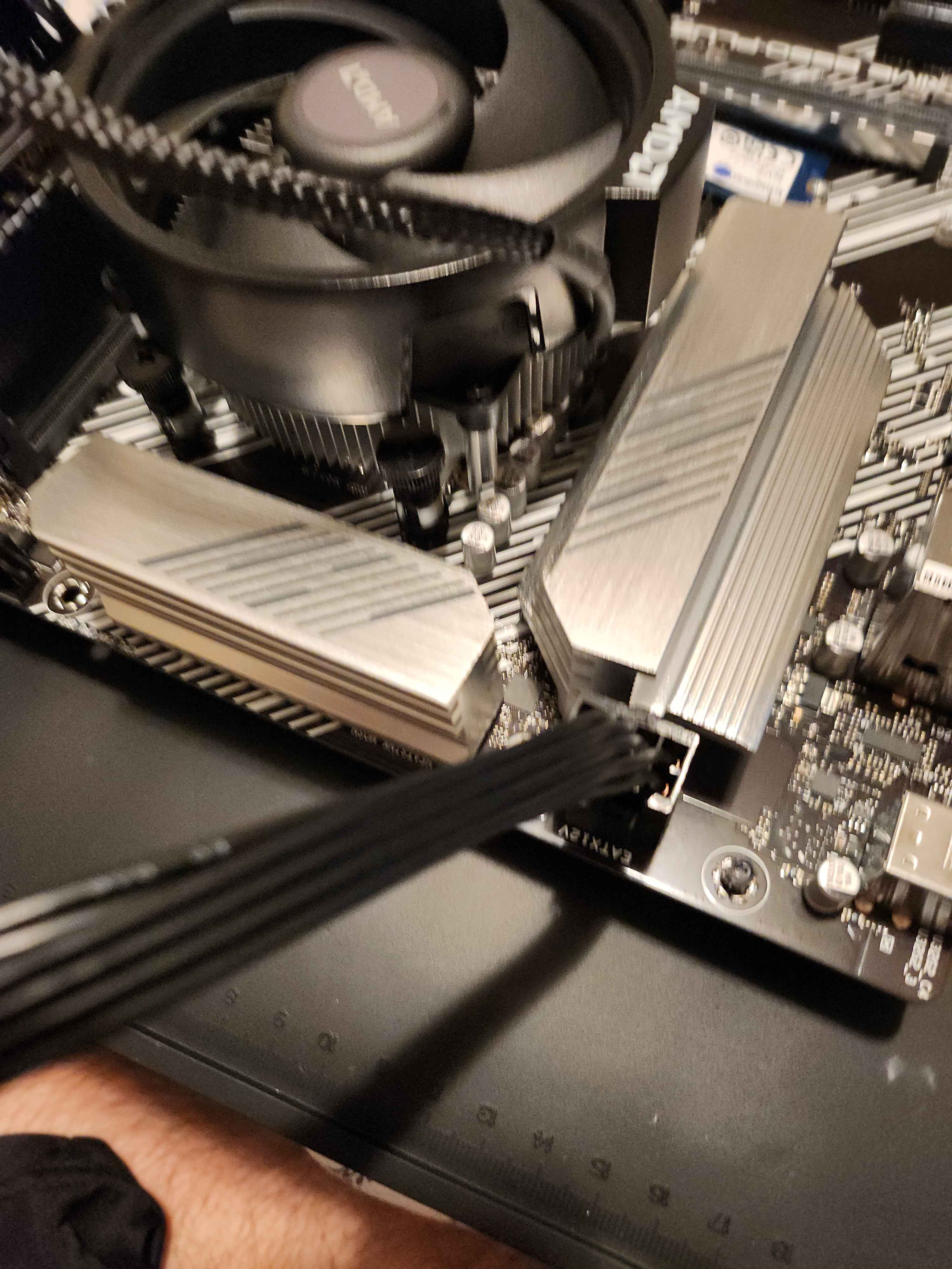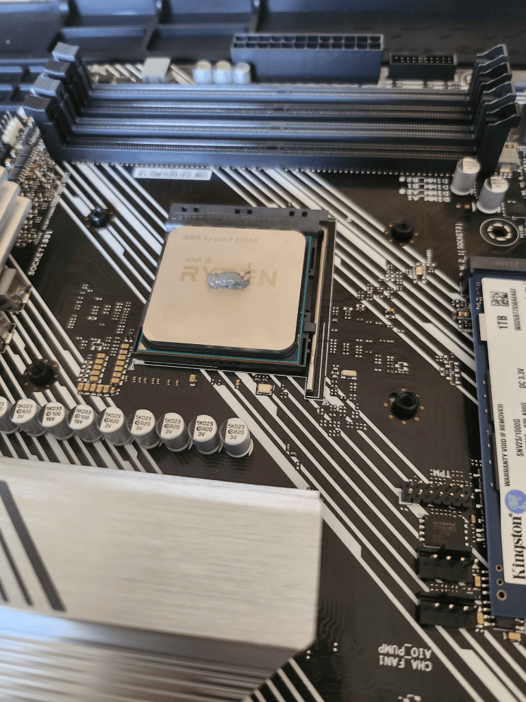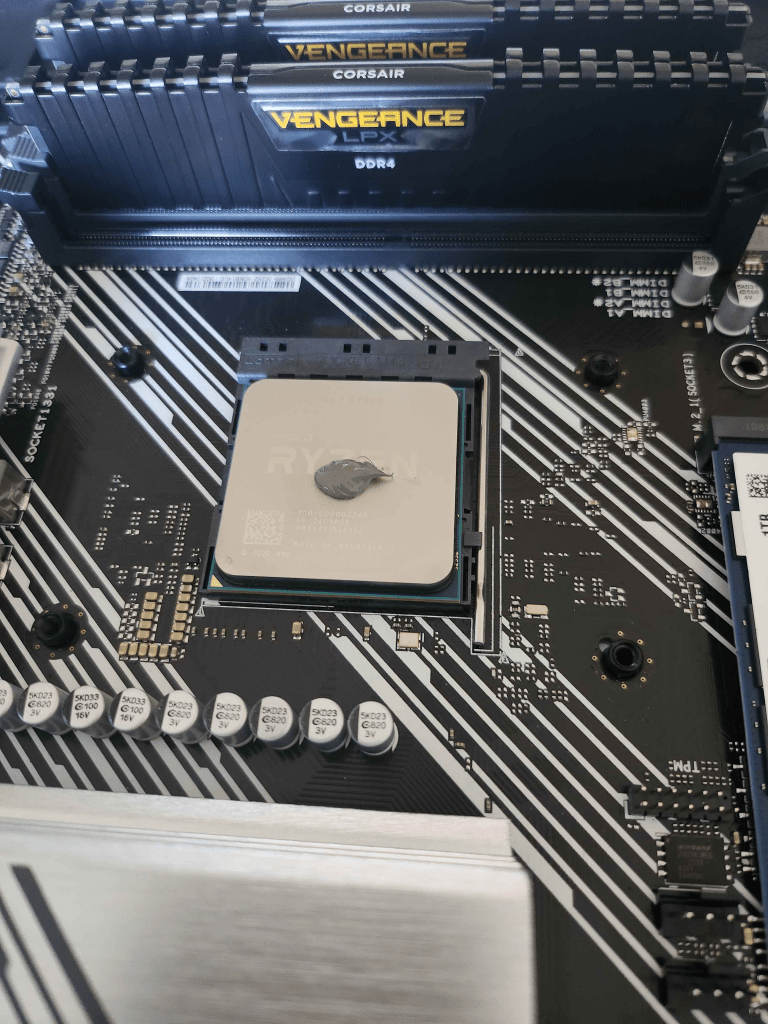 The next step was to install the CPU cooler that came with the AMD Ryzen 7. At the time, I was curious to see how different types and amounts of thermal paste would spread on the CPU. To my surprise, the Ryzen 7’s cooler already had pre-applied thermal paste for convenience. However, I decided to apply my own, so I used a microfiber cloth and isopropyl alcohol to clean off the pre-applied paste from the cooler before adding my own thermal paste.